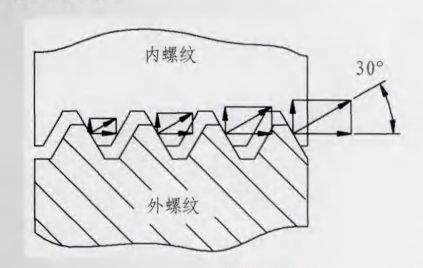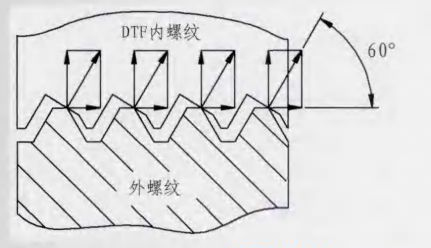 DTFLOCK螺母在內螺紋的牙底處有一個30°的楔形斜面,當螺栓、螺母擰緊時,螺栓的牙尖就緊緊地頂在螺母的楔形斜面上,從而產生了很大的鎖緊力。由于牙形的角度改變,使施加在螺紋間接觸所產生的法向力與螺栓軸成60°角(見圖2),而不是像普通螺紋那樣的30°角,DTFLOCK螺紋法向壓力遠遠大于扣緊壓力,因此,所產生的防松摩擦力也就必然大大增加了。